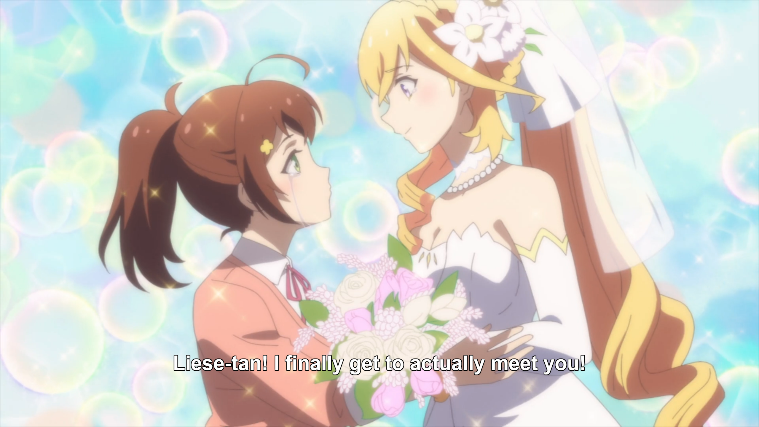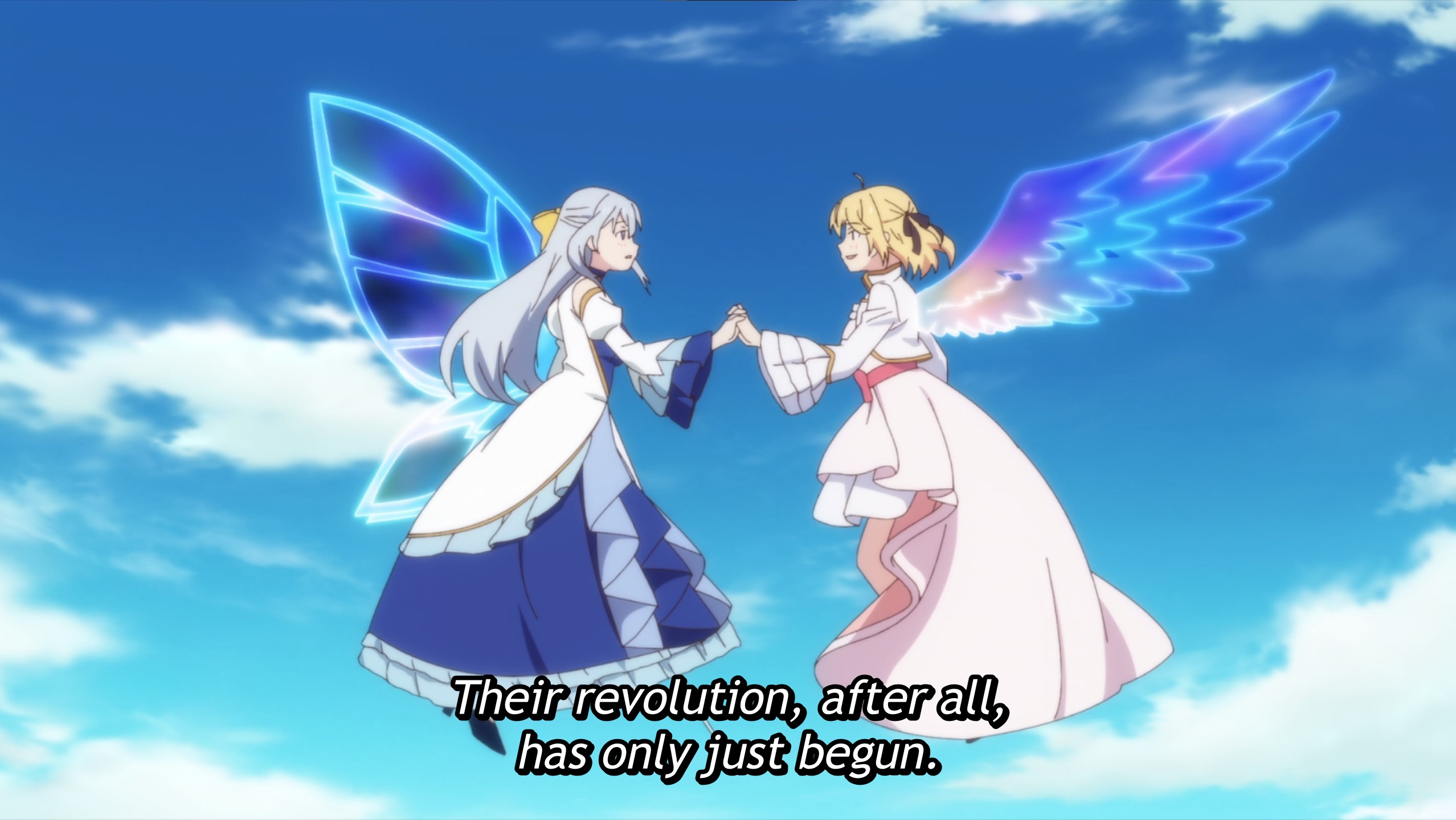 Yet another deconstruction of the otome-game flavor of isekai, wherein a duo of sports commentator types play an otome game together that turns out to be a real world where real stuff is happening, and the characters in the game become able to hear their commentary.