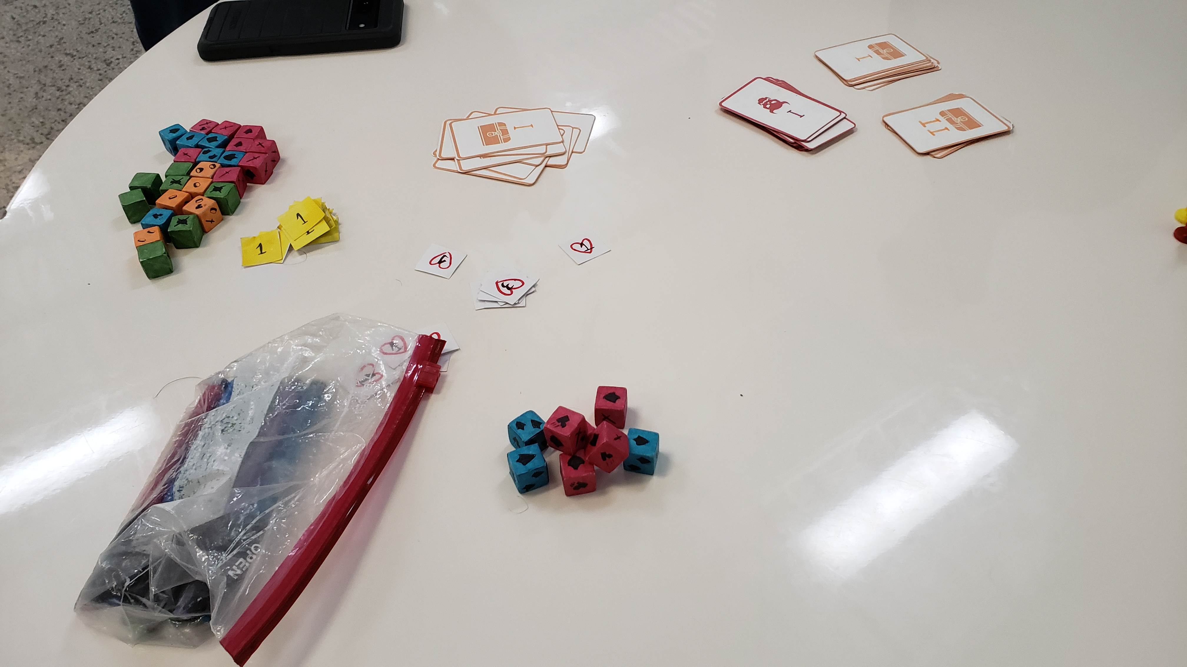 Nearby, Bobby was doing some playtesting for his board game. I missed the initial explanation of the rules, but decided to join in a game. The game involves drawing cards do build up your character and lair, in order to invade other player's lairs and repel them from your own. I lucked into a pretty strong combination of room that allowed for 2 goblin monsters to be present, and then another room that added it's monster to the previous room, resulting in 3 goblins in a room, which resulted in like 10 attack / defence die rolls.