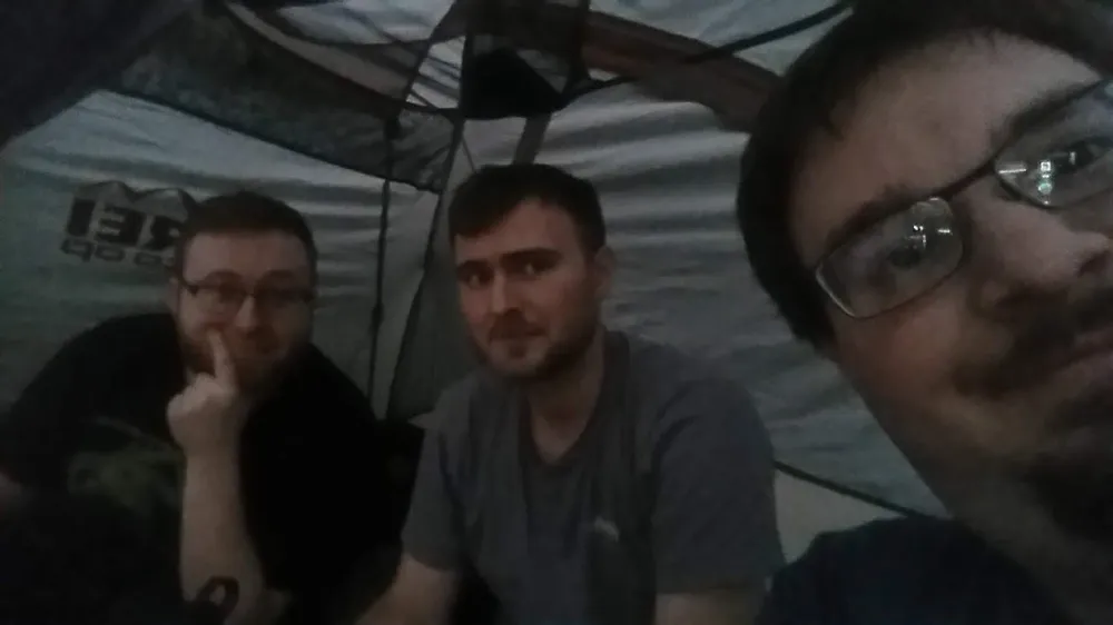 The storm hit, and we sat on the table under our umbrellas eating damp hot dogs. Afterward we retreated to our tent, and talked for a bit before going to sleep.