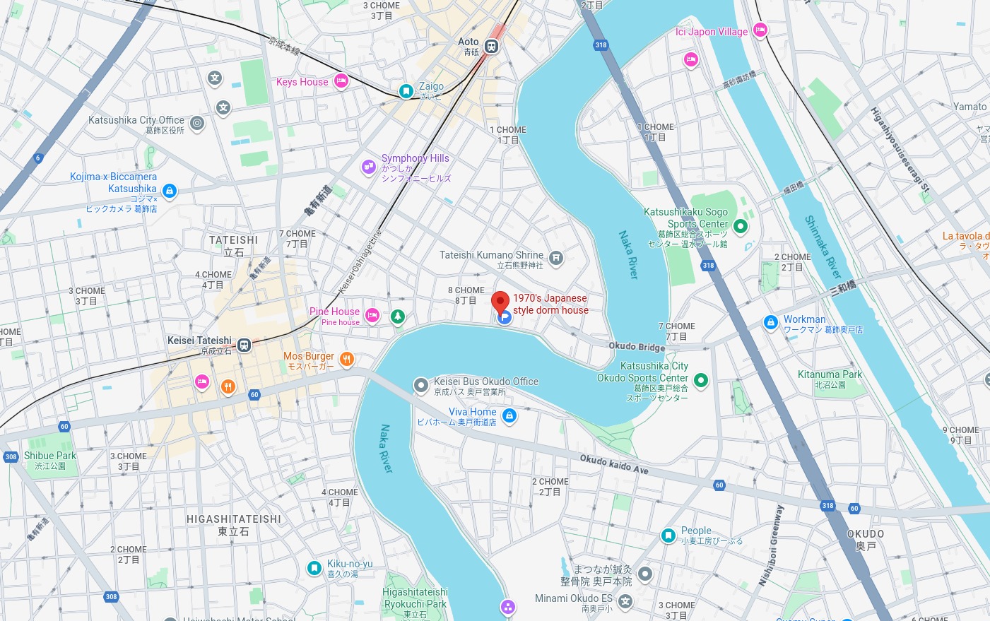 It's located east of central Tokyo, and a ~10 minute walk from 2 transit stations.