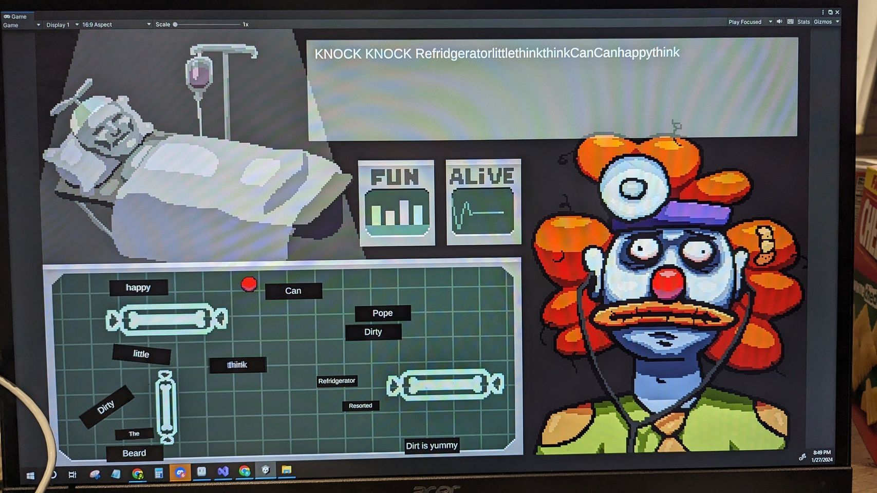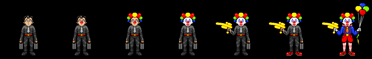 Wally had partied too hard last night, and ended up sleeping until 5pm. This mean't that his dreams of a social engineering ARG were all but dashed, so he focused on working on art. I did ask him to make the main character for my game: a very serious business man that progressivly becomes a clown as you collect your clown tools.