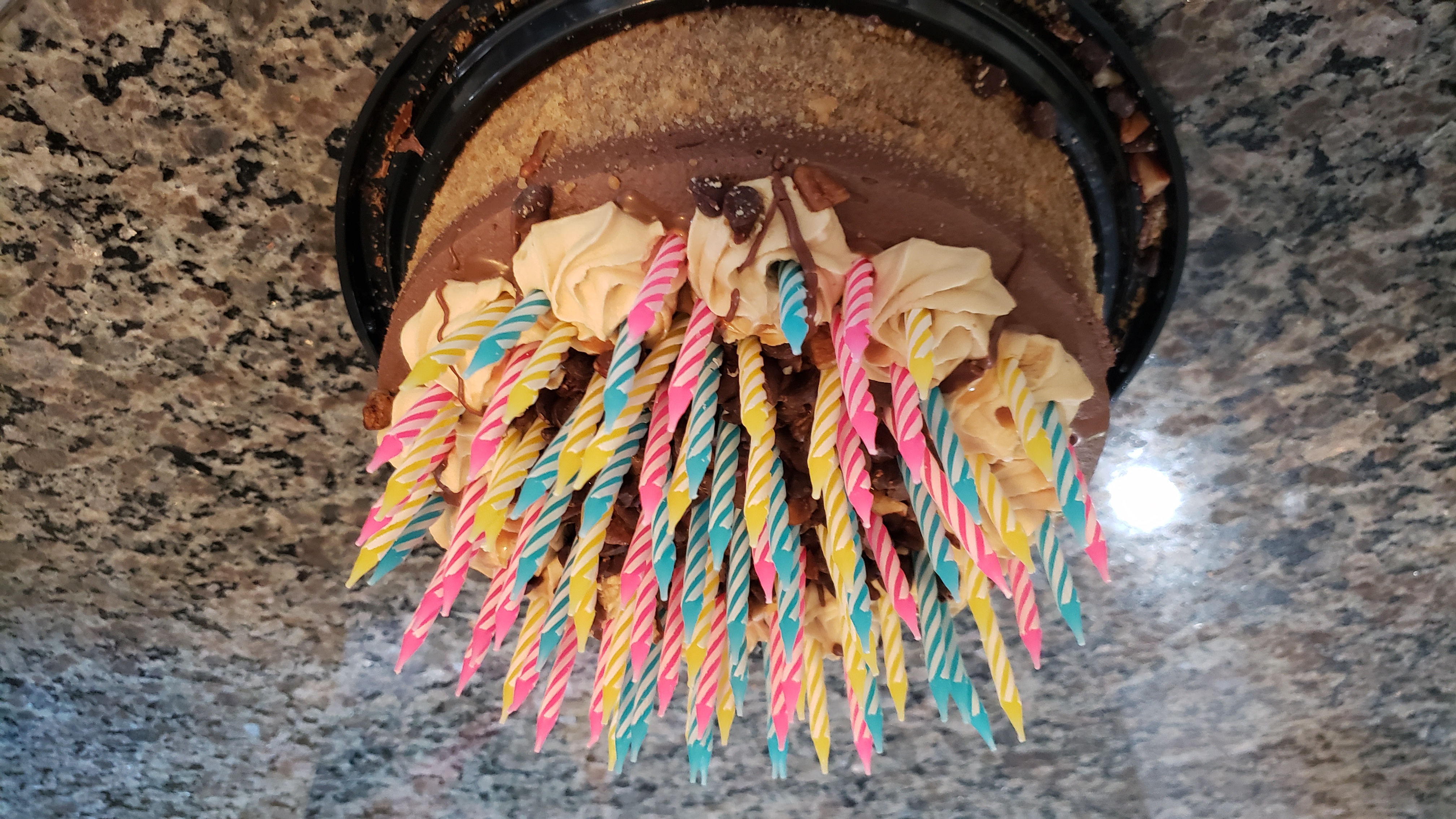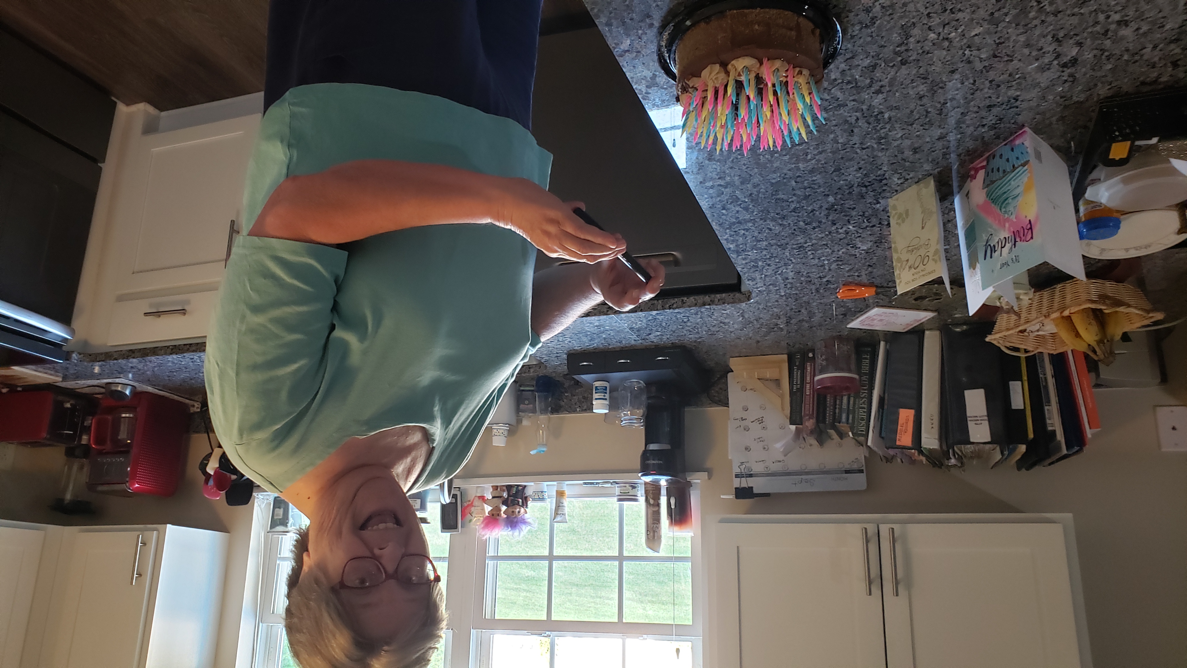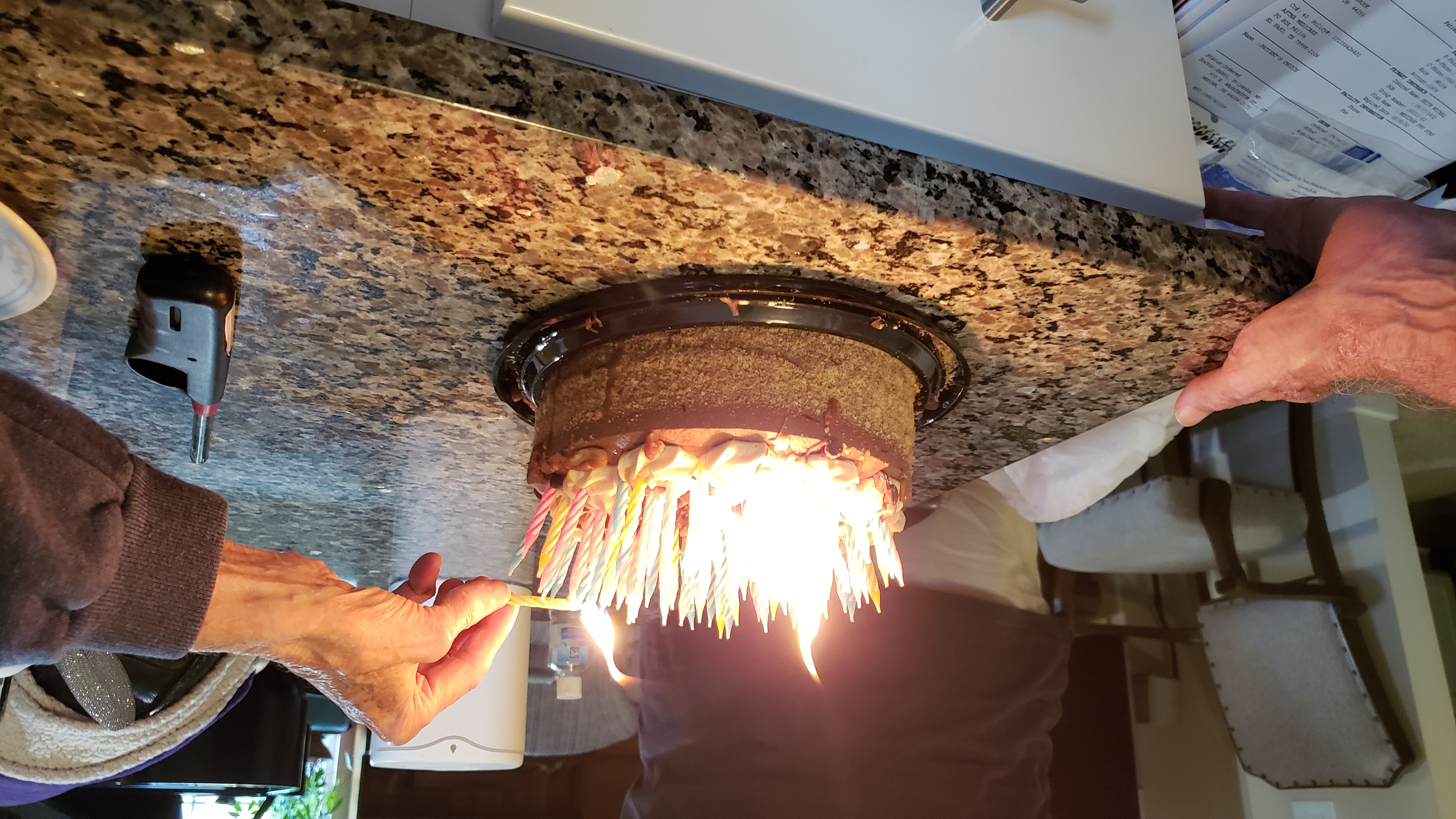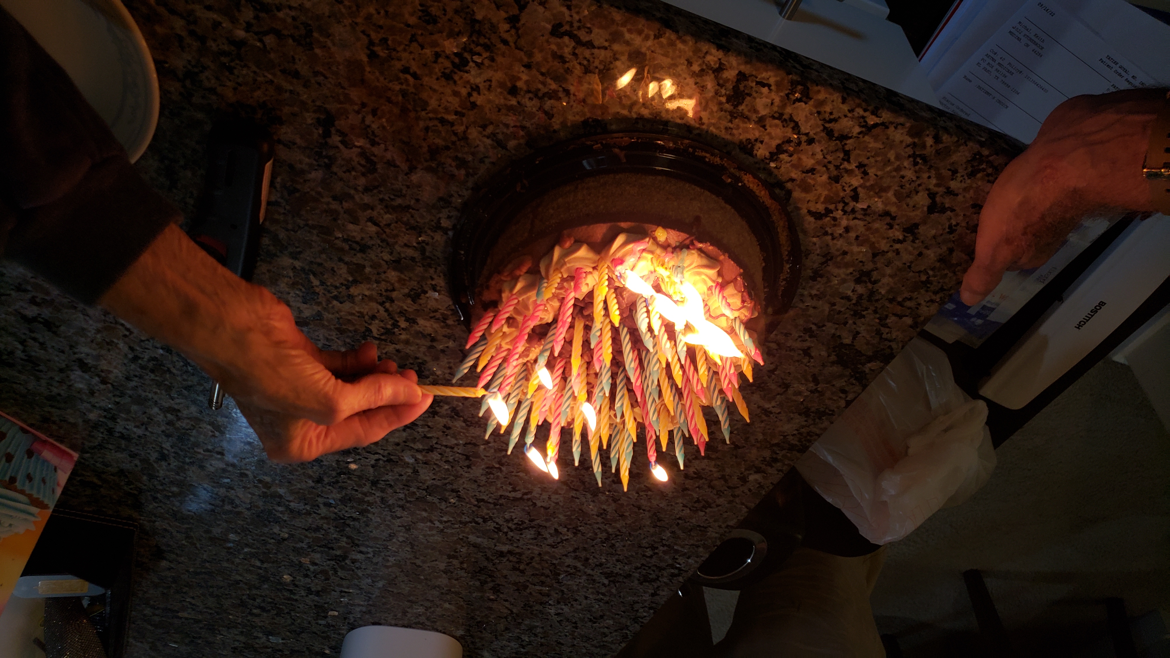 Mom, Dad an I arrived while 5he grandparents were out getting dinner, and set up the cake to suprise him when he got back.
