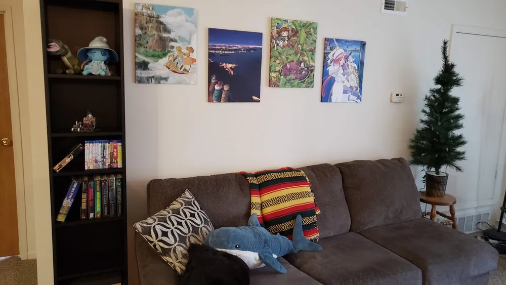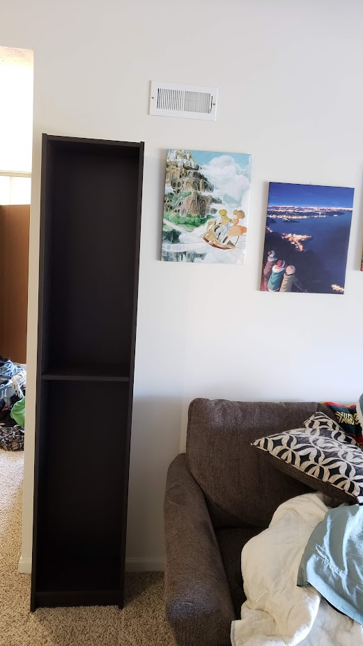 To get it to stay in place, it's supposed to be screwed into the wall, however I ended up using all of the screws I had to secure the back, so I ended up having to go to the store anyway to get more. While I was there, I grabbed a couple other things I will need later, like spackling paste, to cover up the old screw holes from the canvas prints previous position. I also found a long level + measuring stick, which will come in handy when hanging the other pictures in my room.
