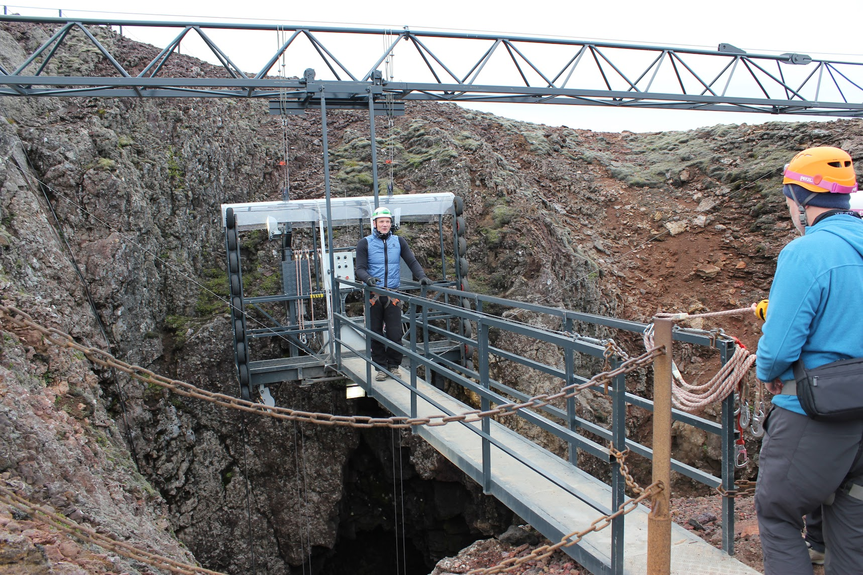 To enter the volcano, there is a modified window washing elevator that lowers you down the volcano's mouth. The elevator was originally built by national geographic, who then donated the elevator to the Icelandic government.