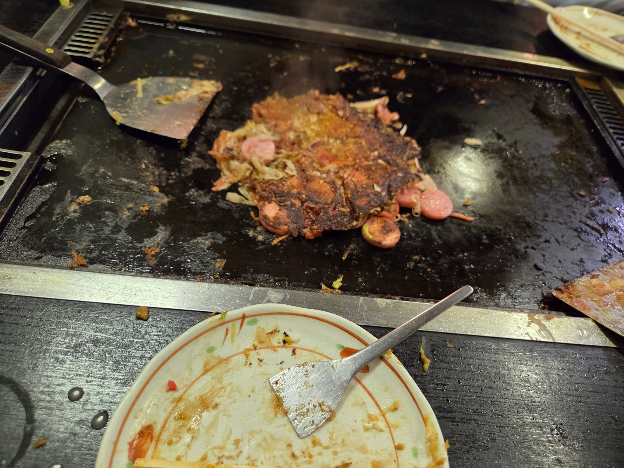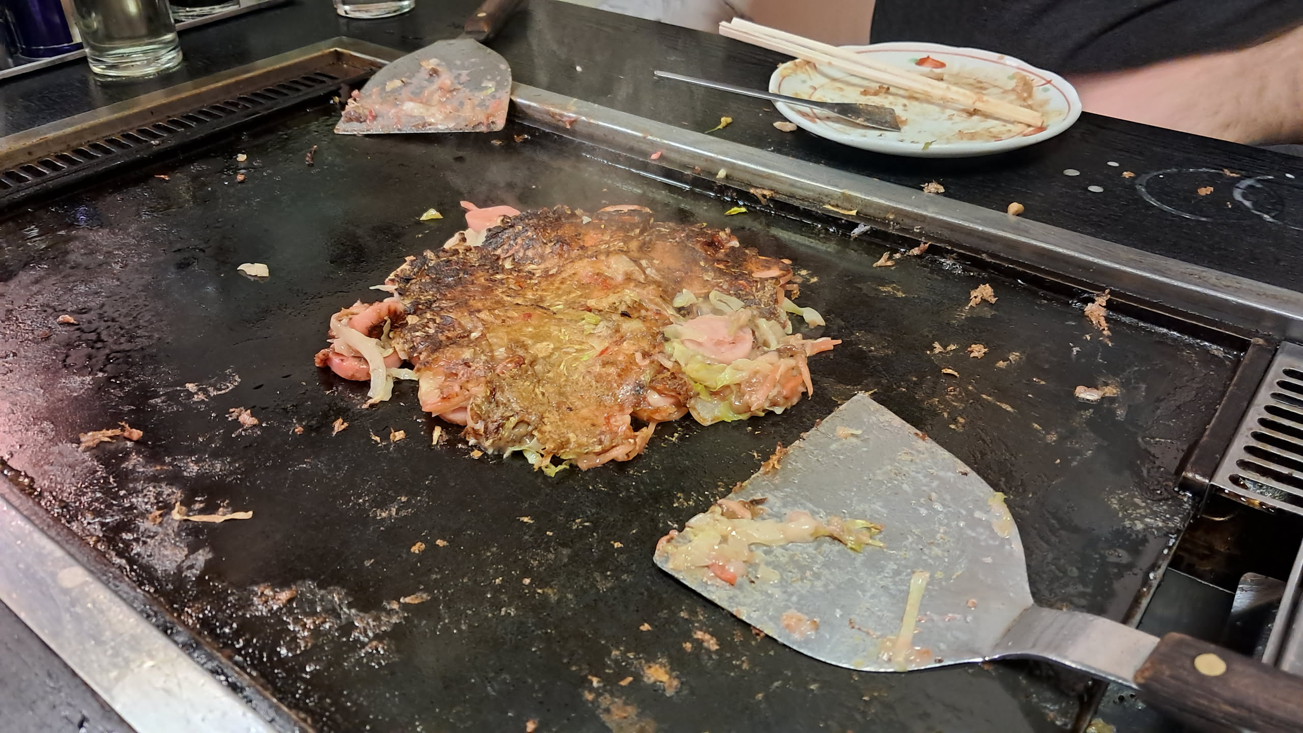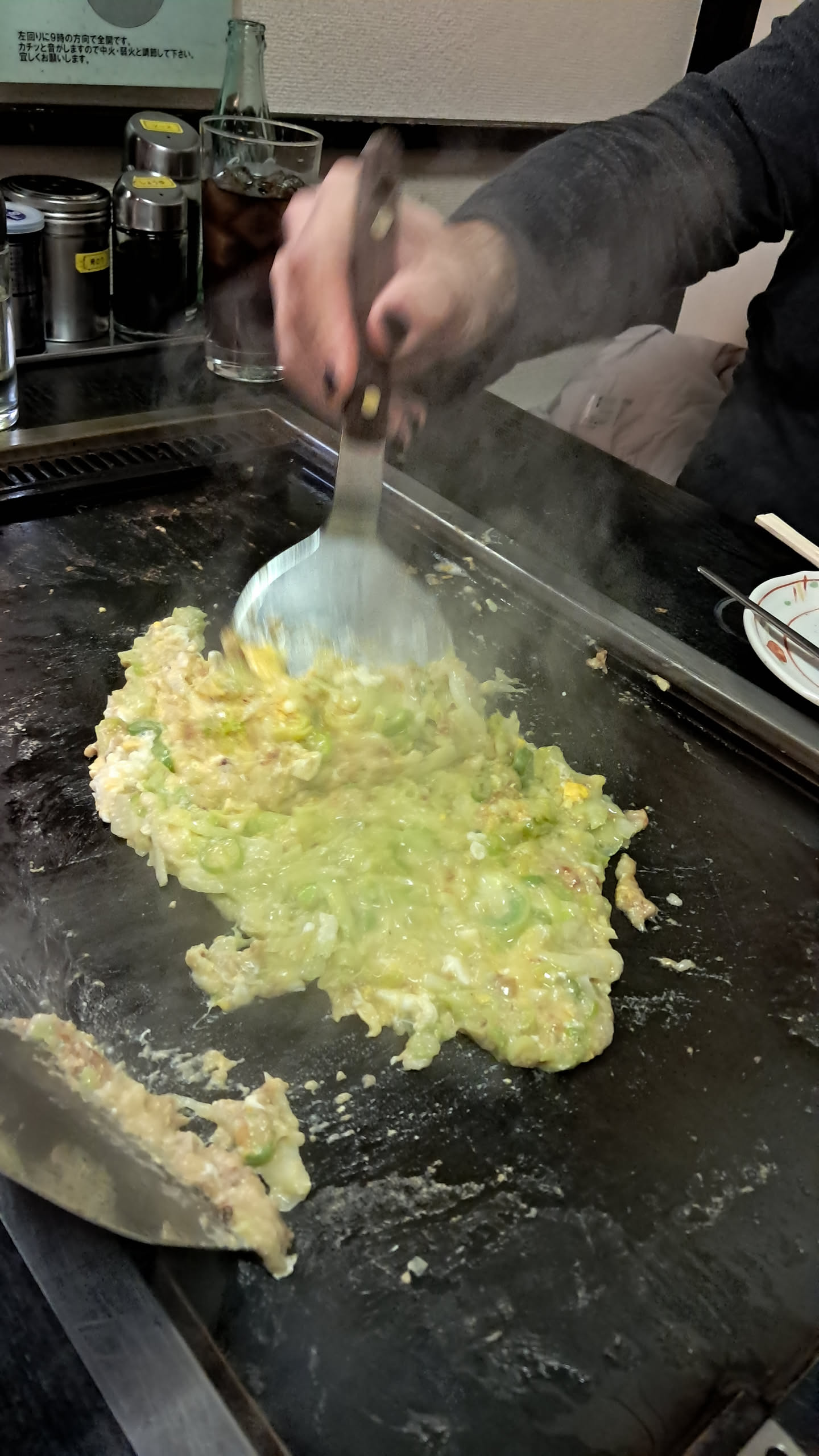 When I had okonomyaki during the last trip, they would prepare it most of the way and then bring it out for you to finish to your preference, but this place worked a bit differently. The old lady just brought out a bowl of ingredients, and we were clearly expected to take it from there. She did show us a bit of how to do it, but for the most part we were on our own, and our first attempt did not go particularly well.
