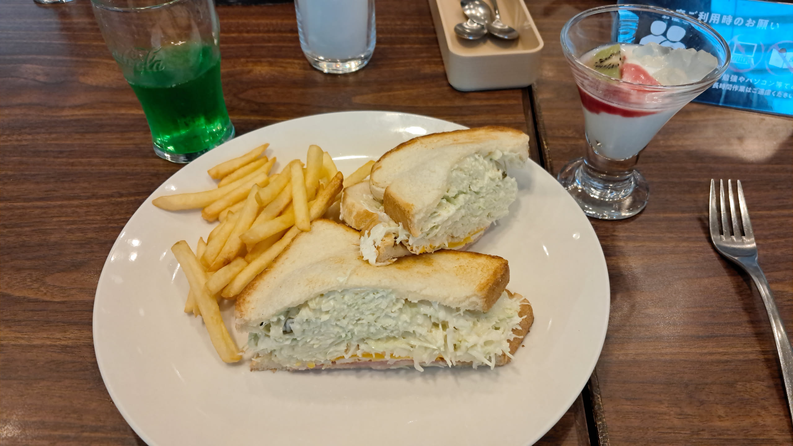 There was a cat robot that brought the food out. Also a drink bar with all you can drink Kiwi juice and melon soda. My cabbage and egg sandwich was light and refreshing, and the kiwi juice was basically cocaine.