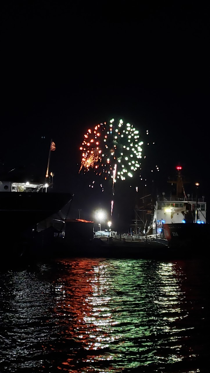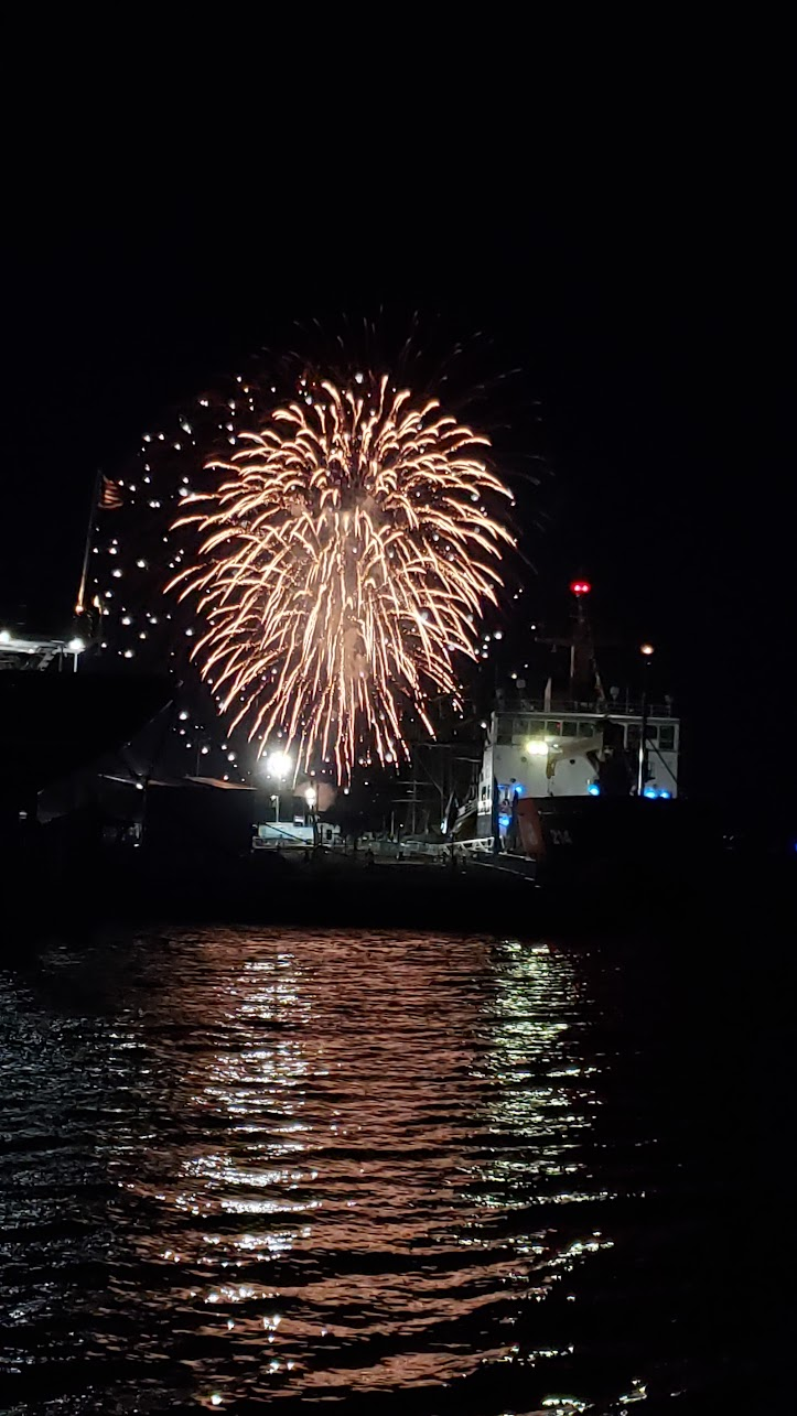 It got a bit chilly, so I stole Jackson's hoodie. We found a spot in the park from which to watch the fireworks, which I incorrectly assumed would be launched from somewhere out in the bay. it turns out they were launched from the opposite side of the tall ships park, but we could still see them mostly.